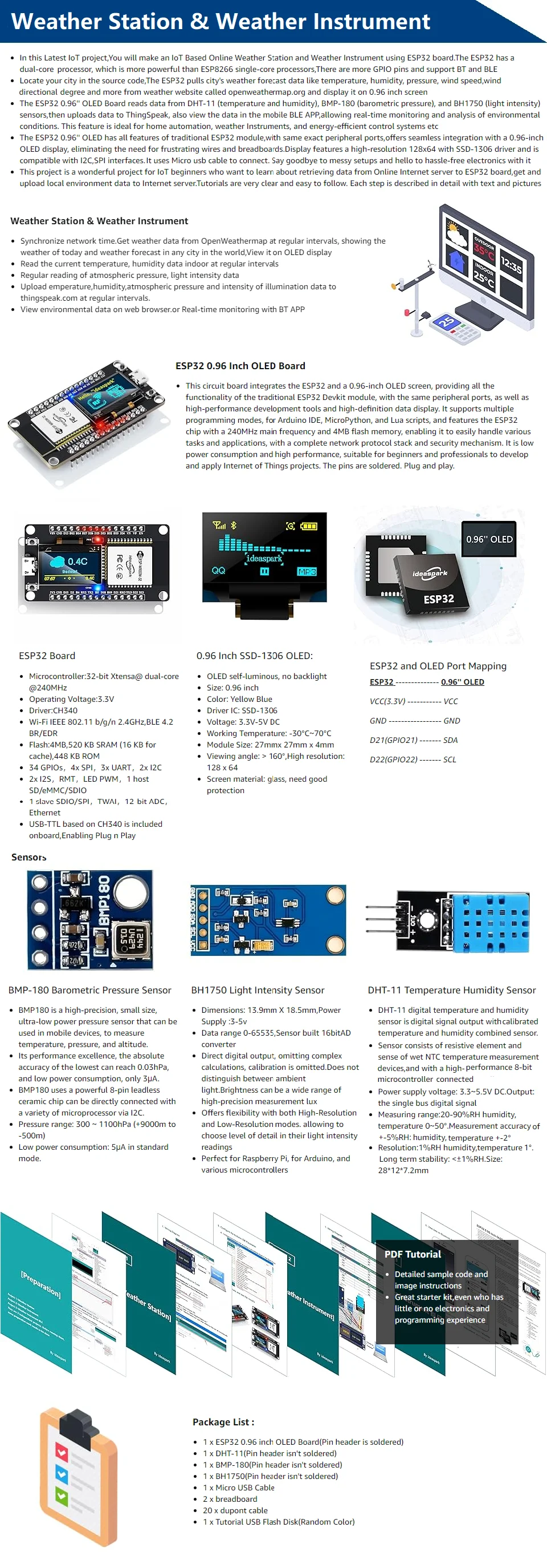ESP32 기상 관측소 기상 계측기 키트 WiFi + BT 통합 0.96 ''OLED DHT-11 Arduino IoT 스타터 용 BMP-180 BH1750 센서