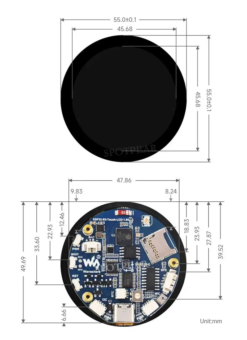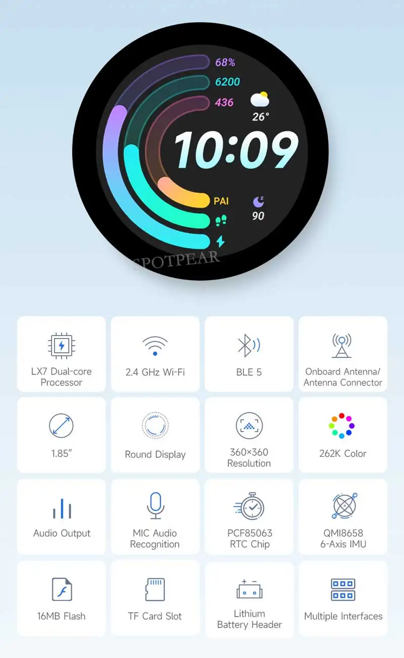 - 1.85인치 360×360 QMI8658 LCD:색상이 선명하고 해상도가 높은 디스플레이를 제공합니다.