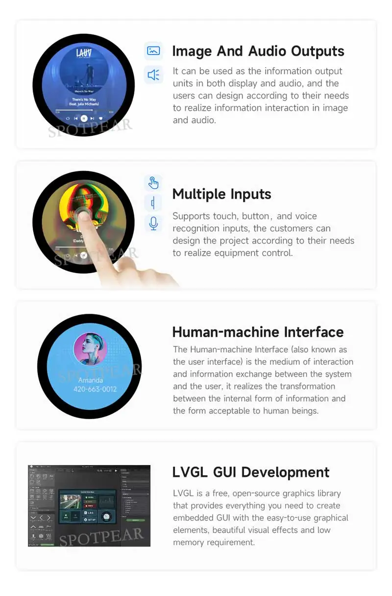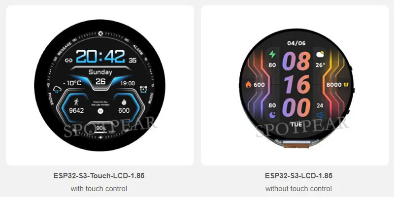 - **사용자 친화적 디자인 및 사용자 경험**n1.85인치의 라운드 LCD 디스플레이는 360×360의 해상도와 262K 컬러를 지원하여 선명한 이미지와 색상을 제공합니다. 옵션으로 제공되는 캐pacitive 터치 기능은 사용자 인터페이스를 더욱 부드럽고 직관적으로 만듭니다. 다양한 인터페이스를 통해 부속 기기를 확장할 수 있어 개발자에게 유연성을 제공합니다.