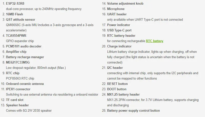 [] 온보드 오디오 디코더, 마이크, QMI8658 6축 센서, RTC 센서, TF 카드 슬롯 및 배터리 재충전 관리 모듈 등