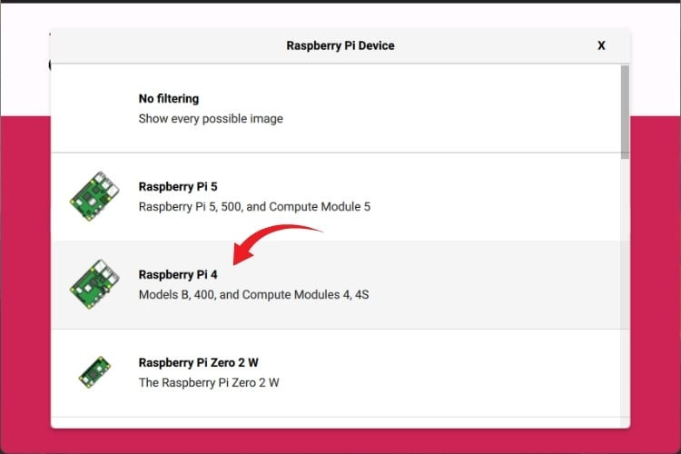- Pi 4를 사용하는 경우: Raspberry Pi 4/400을 선택하세요.