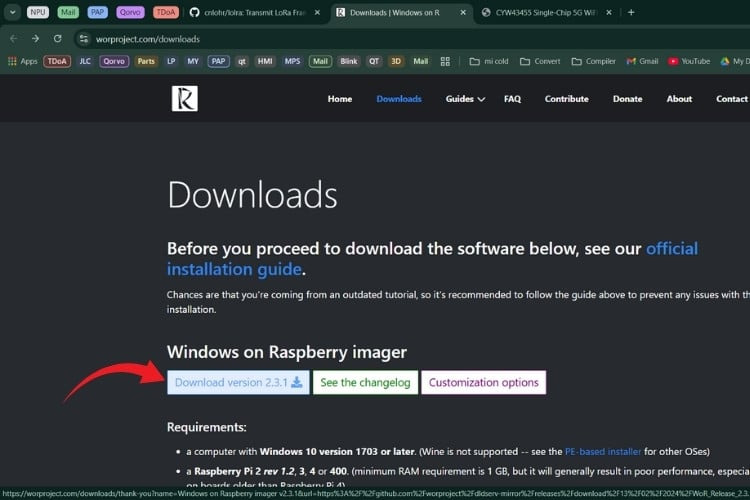 1. 먼저, 공식 WoR 프로젝트 다운로드 페이지 에서 Raspberry Pi Imager의 Windows를 다운로드했습니다 .