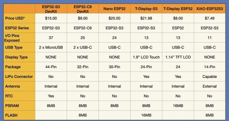 가능한 한 많은 I/O 핀을 원한다면 Espressif DevKits 중 하나를 선택하는 것이 좋습니다. 작은 크기가 필요하다면 Seeeduino XIAO는 저렴한 가격에 훌륭한 소형 보드입니다. 두 개의 LilyGo 보드는 디스플레이가 있는 보드에 대한 요구 사항을 충족할 것입니다.