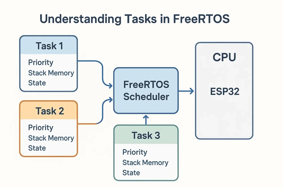 ESP32와 같은 마이크로컨트롤러에서 FreeRTOS는 CPU에서 작업을 스케줄링하는 방식으로 작동합니다. ESP32는 코어가 몇 개뿐이지만, FreeRTOS는 마치 여러 작업이 동시에 실행되는 것처럼 보이게 합니다.