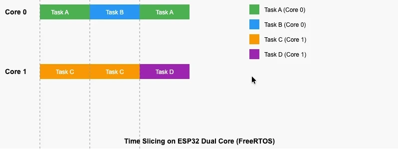 ESP32 에서는 스케줄러가 두 코어 모두에서 실행되어 진정한 병렬 작업 실행을 가능하게 합니다 . 이것이 ESP32 FreeRTOS 시스템을 실시간 애플리케이션에 강력하게 만드는 이유입니다.