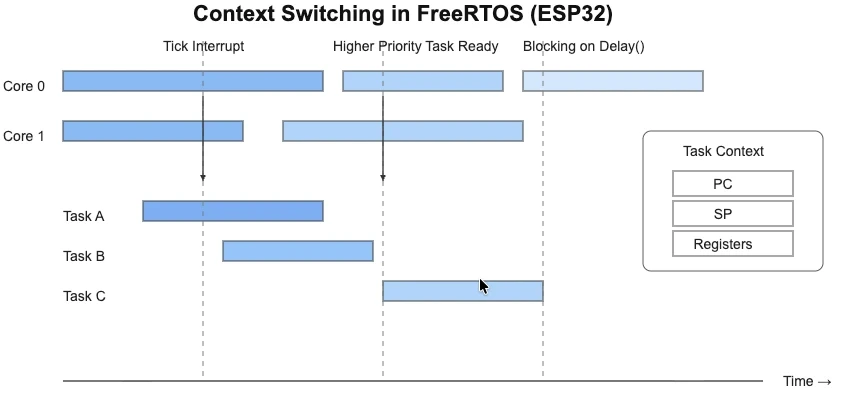 FreeRTOS에서는 여러 작업이 CPU를 공유합니다. 스케줄러는 각 작업의 실행 시점과 일시 정지 시점을 관리합니다. CPU 실행을 한 작업에서 다른 작업으로 전환하는 동작을 컨텍스트 스위칭 이라고 합니다. 이는 ESP32에서 멀티태스킹을 가능하게 하는 핵심 메커니즘입니다 .