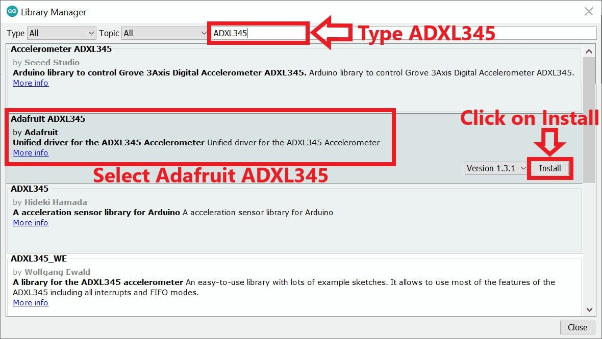 위 예제에서는 Adafruit 라이브러리를 사용합니다. Arduino 라이브러리 관리자를 사용하여 Adafruit ADXL345 라이브러리를 설치해야 합니다 .