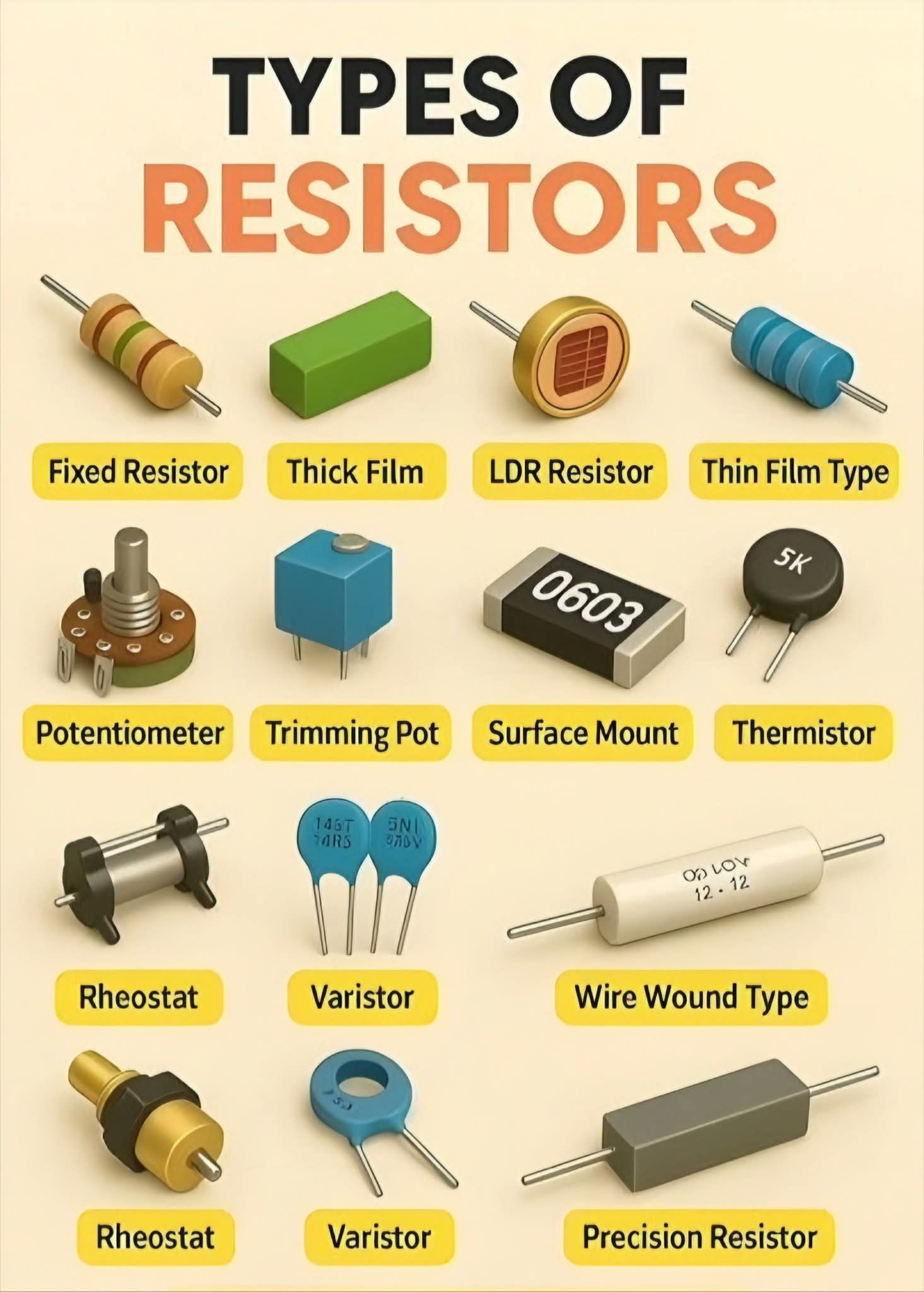 이 이미지는 전자기기에서 가장 중요한 부품 중 하나인 다양한 종류의 저항기를 보여줍니다.