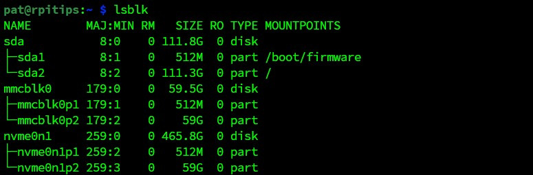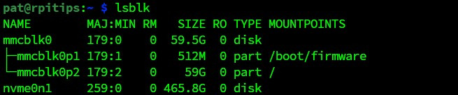 NVMe SSD( nvme0n1 )에 이제 SD 카드( mmcblk0 ) 와 동일한 두 개의 파티션( p1 및 p2 )이 있는 것을 볼 수 있습니다 . 좋아 보이네요!