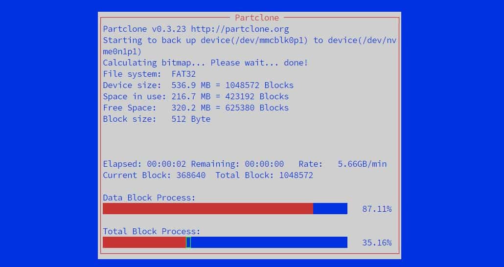Clonezilla가 SD 카드와 모든 파티션의 복제를 시작합니다.
