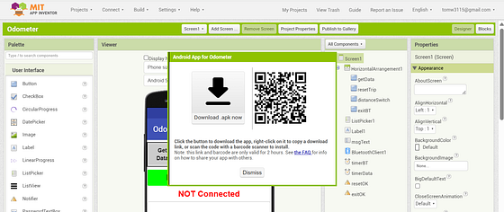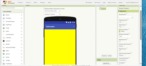 이제 Android 기기가 브라우저 기기와 동일한 LAN(Local Area Network)에 연결되어 있다고 가정하고, 방금 설치한 MIT AI2 Companion 앱을 엽니다. 'QR 코드 스캔' 버튼이 표시됩니다 . 이 버튼을 선택하고 브라우저 창에 있는 QR 코드를 스캔합니다. 그러면 브라우저의 뷰어 창에 보이는 이미지가 Android 기기에 표시됩니다. 브라우저 창에서 변경 사항을 적용하면 Android 기기에도 변경 사항이 표시됩니다. 예를 들어, 객체 트리에서 Screen1 객체(현재까지 유일한 객체)를 선택하고 배경색을 노란색으로, 제목을 주행거리계로 설정합니다. 브라우저와 Android 기기에서 화면이 다음과 같이 표시되어야 합니다.