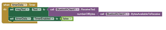 6. timerData라는 두 번째 시계를 사용하여 연결된 블루투스 서버가 기기로 데이터를 전송했는지 확인합니다. 이 타이머는 버튼 중 하나를 누르면 활성화되고, 데이터가 수신되면 비활성화됩니다. 수신된 데이터는 msgText라는 텍스트 상자에 표시됩니다.