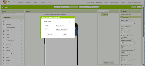 MIT App Inventor는 여기 웹에서 호스팅됩니다 . 메인 페이지에서 "앱 만들기!" 버튼을 선택하면 Gmail 계정에 연결된 계정을 설정하라는 메시지가 표시됩니다. 이는 저장 및 인증에 Google 인프라를 사용하기 때문입니다. Gmail 계정이 없는 경우, 애플리케이션을 사용하려면 계정을 만들어야 합니다. Gmail 계정을 입력하면 다양한 옵션이 있는 프로젝트 개발 화면으로 이동합니다. " 프로젝트" 메뉴 항목을 선택한 다음 "새 프로젝트 시작"을 선택합니다 . 프로젝트 이름을 입력하고 "툴킷"과 "테마"는 기본값을 사용한 후 "확인"을 선택합니다 . 아래 화면과 유사할 것입니다.