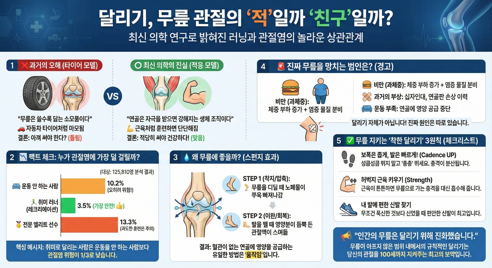 1. 달리기가 무릎 연골을 타이어처럼 닳게 한다는 것은 잘못된 속설이며, 연골은 살아있는 조직이라 적당한 자극을 주면 오히려 더 튼튼해짐