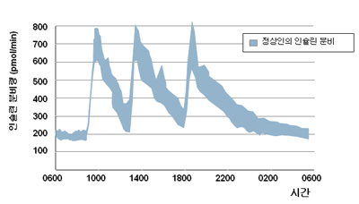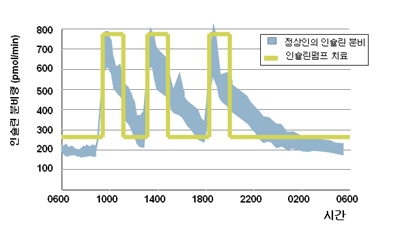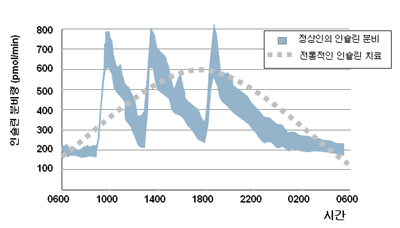 이러한 방식으로 인슐린을 공급하면 혈청에 나타나는 인슐린 농도의 양상은 (그림2)와 같이 실제로 인체에서 생리적으로 요구되는 인슐린의 양상과 시간적으로나 양적으로 매우 다른 양상이 됩니다.