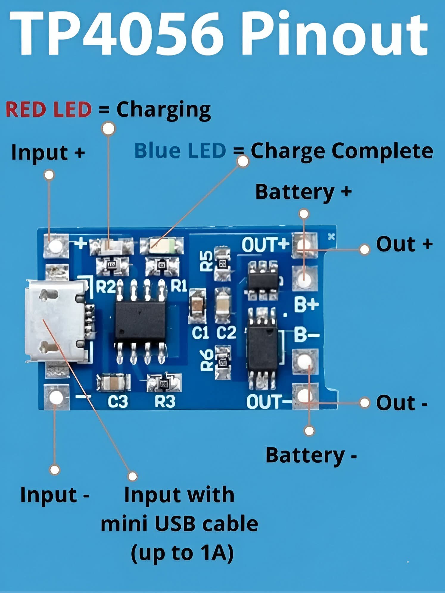 그림은 TP4056의 핀 배열(TP4056 핀 배치)을 보여줍니다. 이는 매우 흔히 사용되는 리튬 이온(Li-ion) 및 리튬 폴리머(Li-Po) 배터리 충전기 모듈입니다.