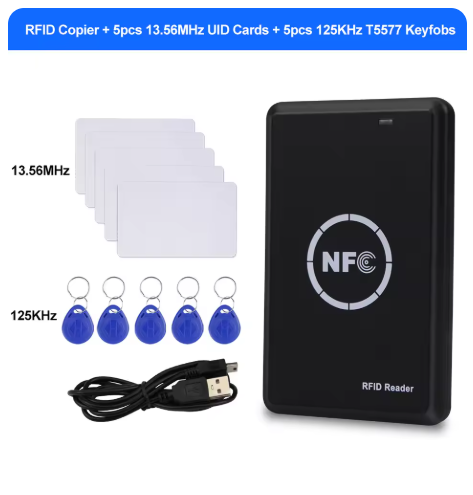 답변: RFID 복사기 + 5pcs UID 카드 + 5pcs T5577 keyfobs를 구입하는 경우.5pcs UID 카드는 mi-fare 1k 카드를 복사하는 데 사용되는 13.56MHz 주파수에서 작동합니다.5pcs T5577 keyfobs는 EM4100, TK4100 카드를 복사하는 데 사용되는 125KHz 주파수로 작동합니다.그들은 다른 유형의 칩입니다.