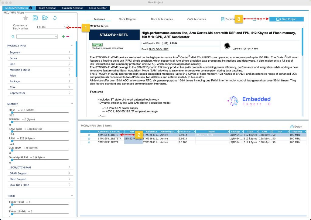 STM32 MCU를 검색하고 MCU를 선택한 후 다음과 같이 '새 프로젝트 시작'을 클릭합니다.