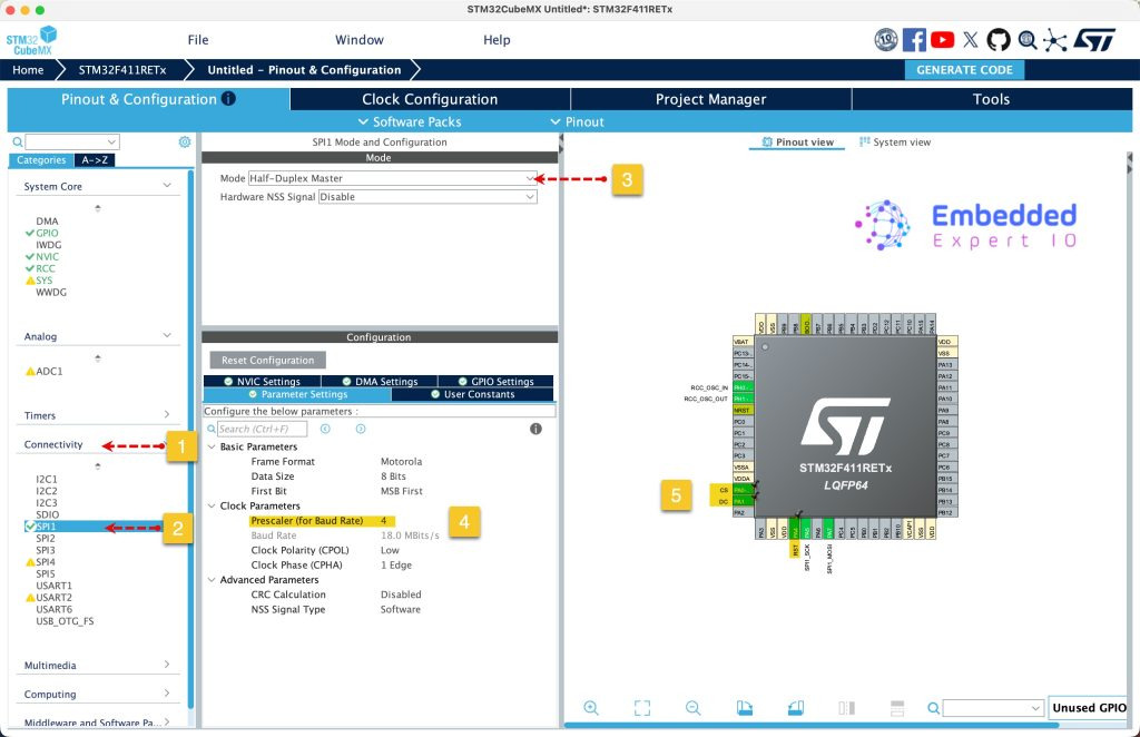 다음으로, 연결성에서 SPI를 선택하고 마스터 하프 듀플렉스로 설정하고, 프리스케일러를 4로 설정합니다. 이를 선택하면 SPI 클록은 18MHz가 되는데, 설정을 고려하면 충분히 좋은 수준입니다.
