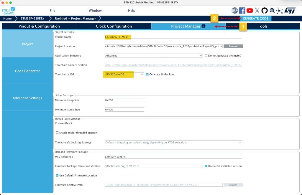 다음으로, 프로젝트에서 프로젝트 이름을 지정하고, 프로젝트 위치를 선택하고, 툴체인/IDE에서 STM32CubeIDE를 선택하고 다음과 같이 코드 생성을 클릭합니다.
