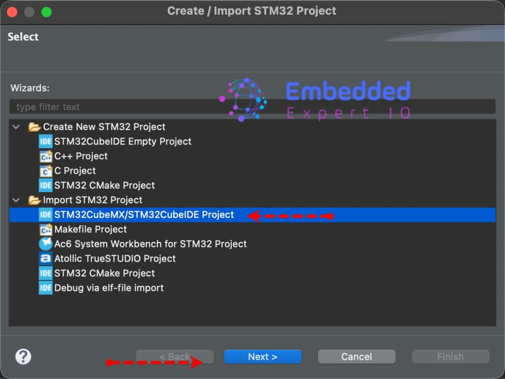 다음으로, STM32 프로젝트 가져오기에서 STM32CubeMX/STM32CubeIDE 프로젝트를 선택하고 다음과 같이 다음을 클릭합니다.