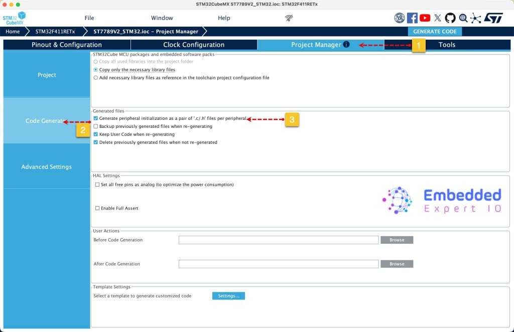 다음으로, 프로젝트 관리자에서 코드 생성을 선택하고 주변 장치 초기화를 다음과 같이 .c/.h 파일 쌍으로 설정합니다.