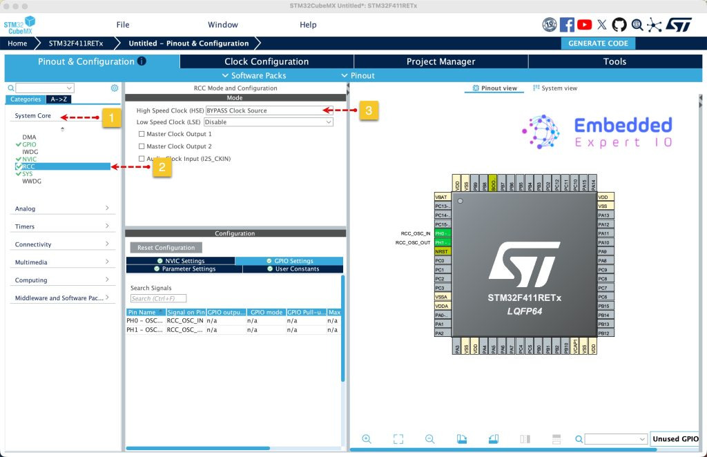 다음으로, 시스템 코어에서 RCC를 선택하고, 보드에 외부 발진기가 있는 경우 크리스털/세라믹 발진기를 선택하고, Nucleo 보드의 경우 발진기를 바이패스합니다. 이 가이드에서는 STM32F411 Nucleo-64를 사용하므로, 다음과 같이 바이패스 발진기를 사용합니다.