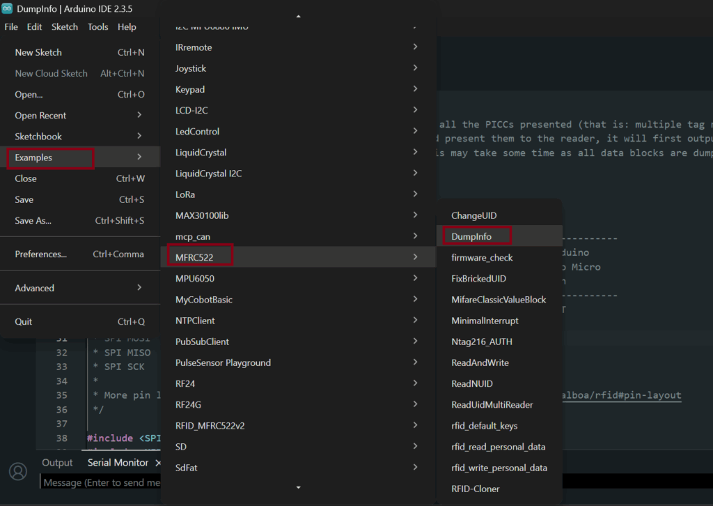 이 튜토리얼에서 제공하는 RFID 스케치를 로드합니다.