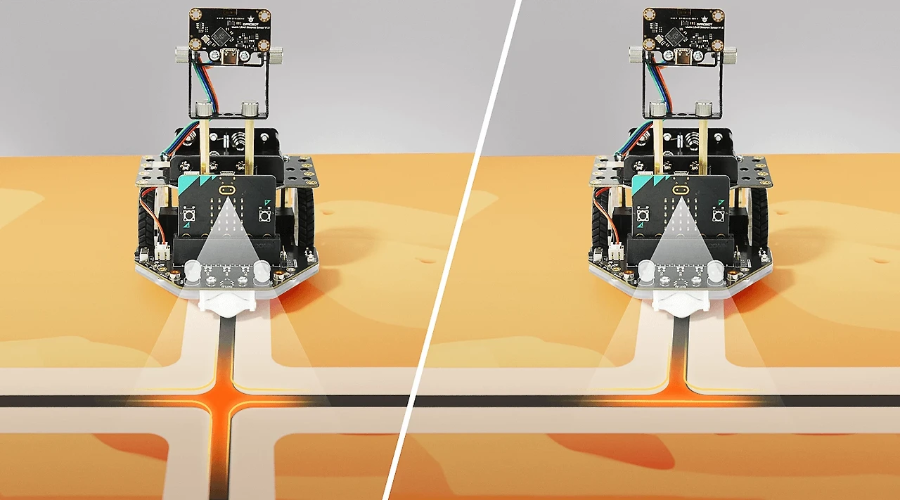 로봇 코어에 직접 통합된 알고리즘을 통해 라인 추적 및 교차로 내비게이션을 더욱 효율적으로 익힐 수 있습니다. 온보드 라인 추적 기능은 이러한 기본 기술에 대한 진입 장벽을 크게 낮춰 학생들이 고차원 전략에 집중할 수 있도록 합니다. 또한, 혁신적인 내장 교차로 인식 기능은 다양한 교차로 유형(사거리, T자 교차로 등)을 실시간으로 식별하여 복잡한 지도 기반 과제를 생성하고 경쟁의 다양성을 강화합니다. 이러한 기능들은 독립적으로 작동하여 메인 컨트롤러가 다른 작업에 집중할 수 있도록 해줍니다.