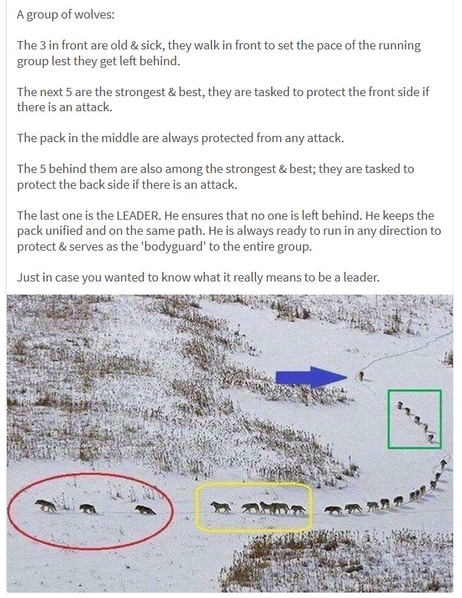 오늘 페이스북을 스크롤하다가 (요즘 밀레니얼 세대들이 흔히 그렇듯이) 이동하는 늑대 무리 사진을 발견했어요. 처음에는 사진과 게시물이 좀 이상하다고 생각했죠. 그런데 클릭해서 자세히 읽어보니, 사진에 담긴 이야기와 의미가 제 마음에 와닿았어요. 비슷한 비유를 들어본 적은 있지만, 이 사진은 '리더십'이라는 주제를 정말 잘 표현해주는 것 같아서 공유하고 싶었어요.
