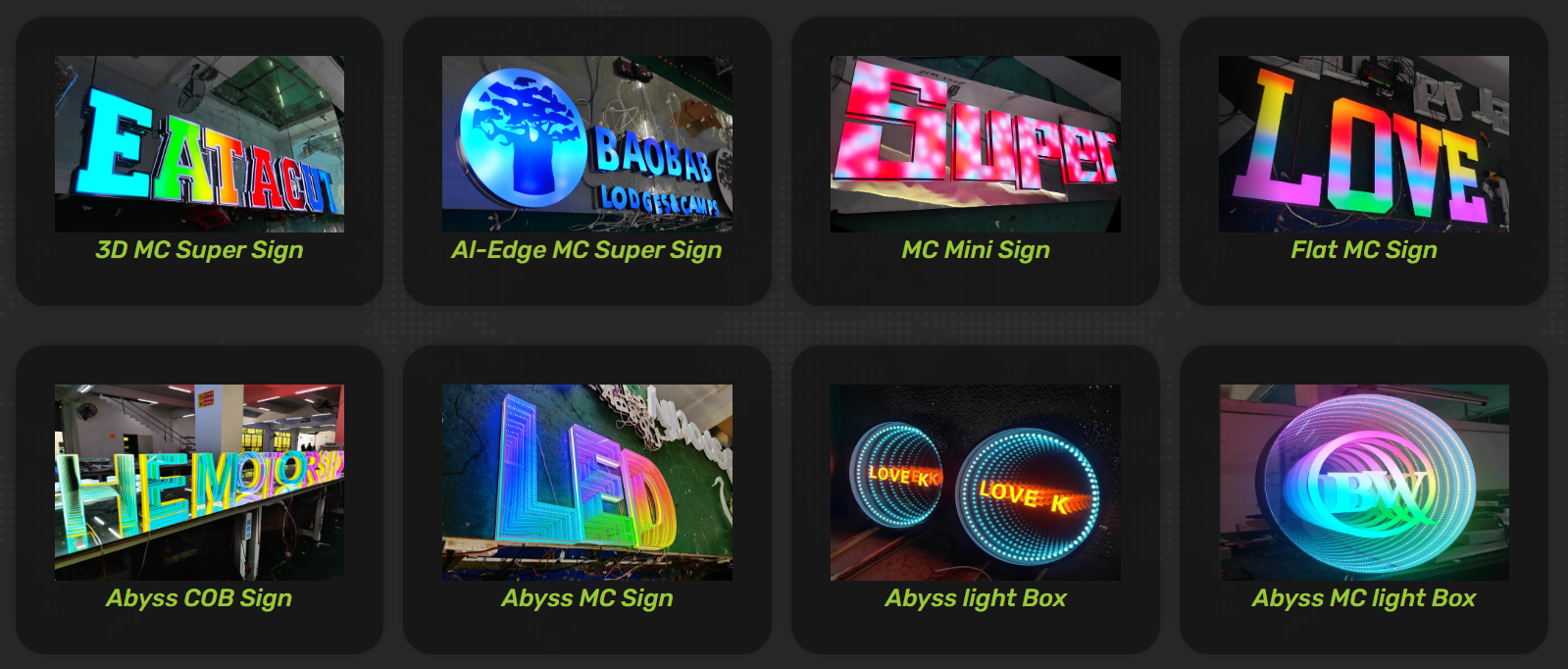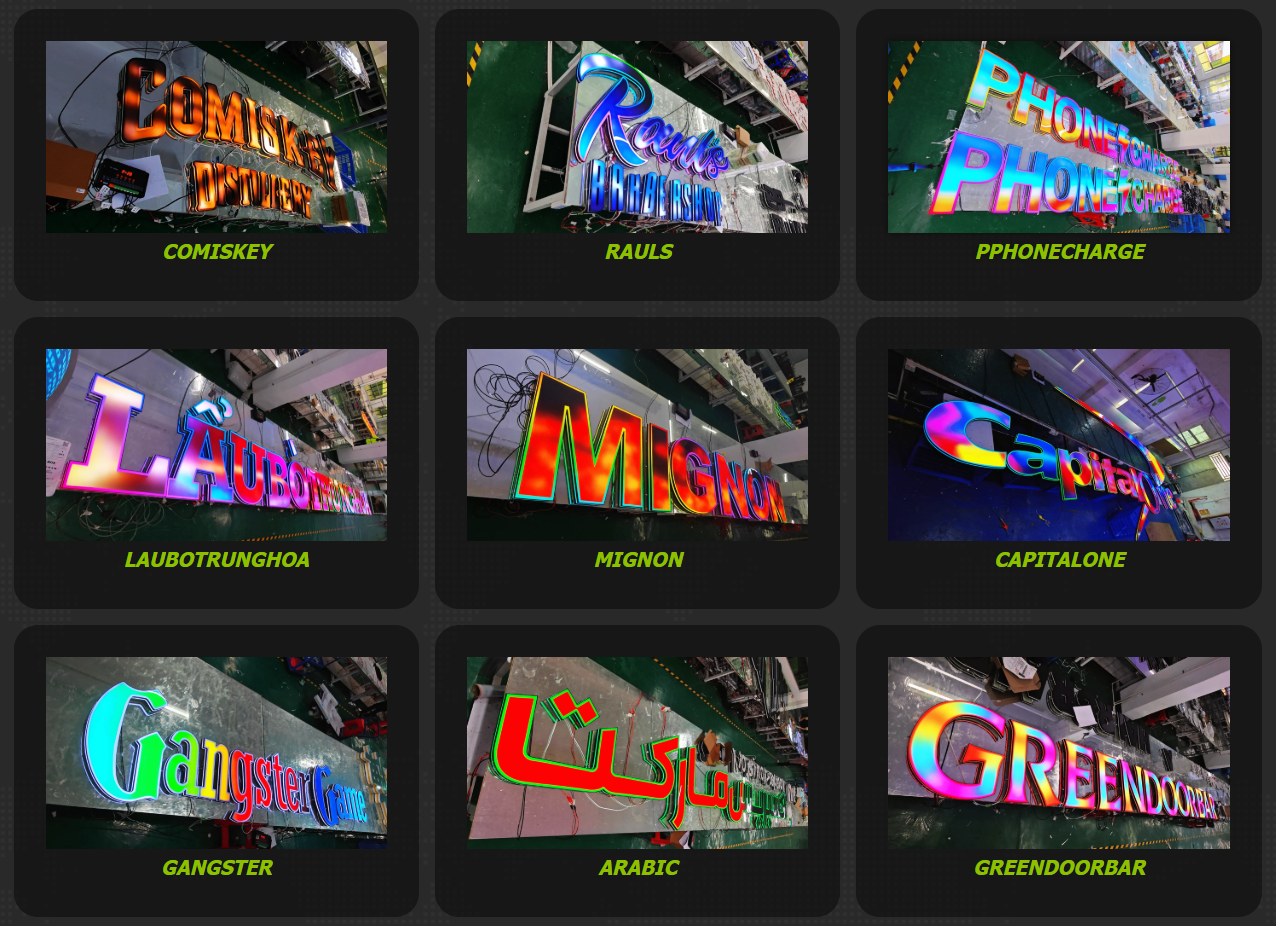 알루미늄 테두리 액체 아크릴 슈퍼 문자, 3D 프린팅 슈퍼 문자, 테두리 없는 3D 프린팅 문자, 특수 색상 표면 백색광 슈퍼 문자 , 양면 슈퍼 문자, 복잡한 슈퍼 문자, 알루미늄 테두리/3D 테두리 심연 문자, 알루미늄 테두리/3D 테두리 다층 심연 라이트 박스, 매직 컬러 발광 문자 , 단색/7색 인터넷 유명 다이내믹 컨트롤.