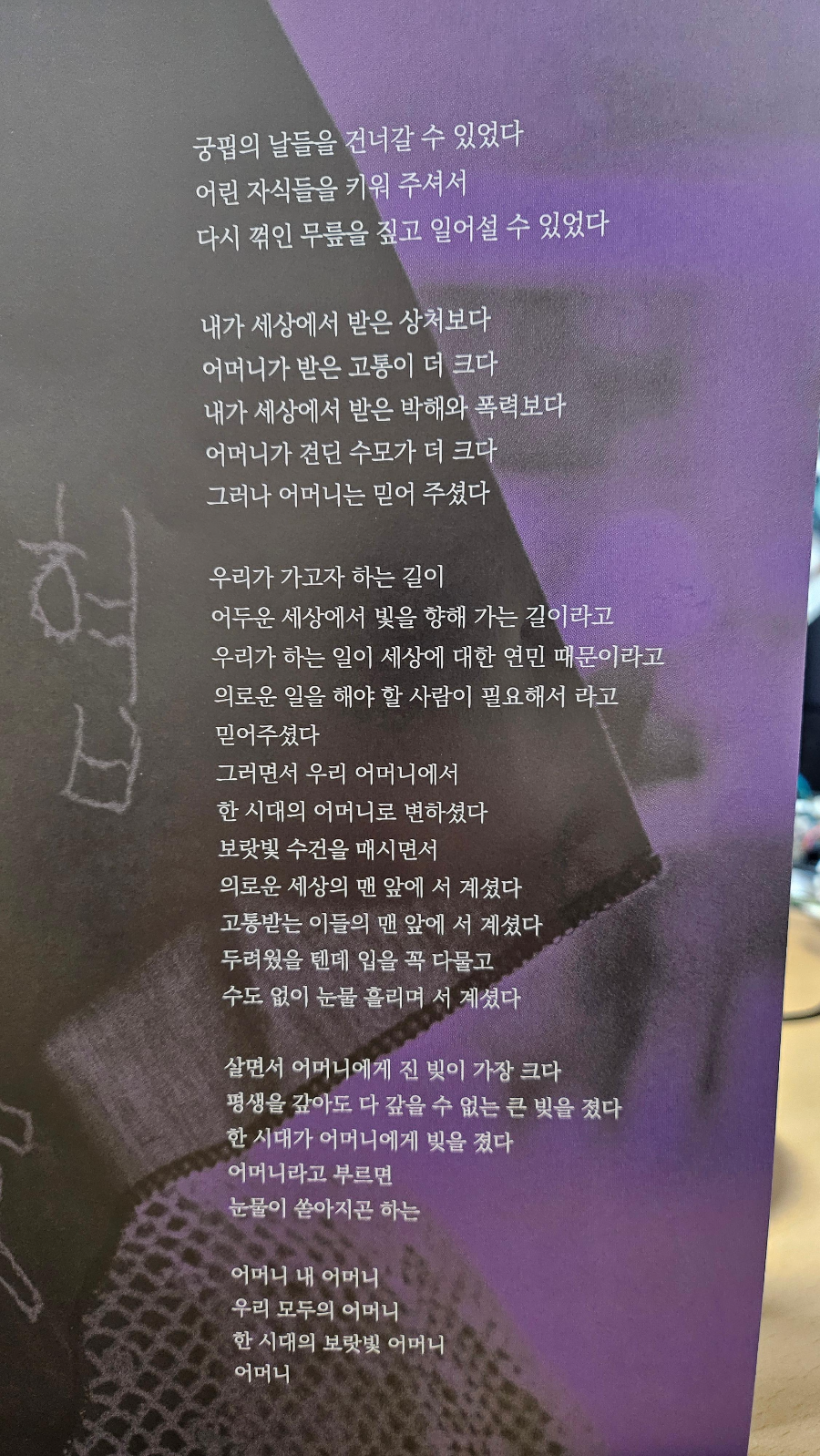 사랑으로 어머니는 침묵했죠. 어쩌면 침묵이 어머니의 피난처가 되었을지도 모릅니다. 고통을 다시 겪지 않기 위한 자기 보호의 방식이었을지도 모릅니다.