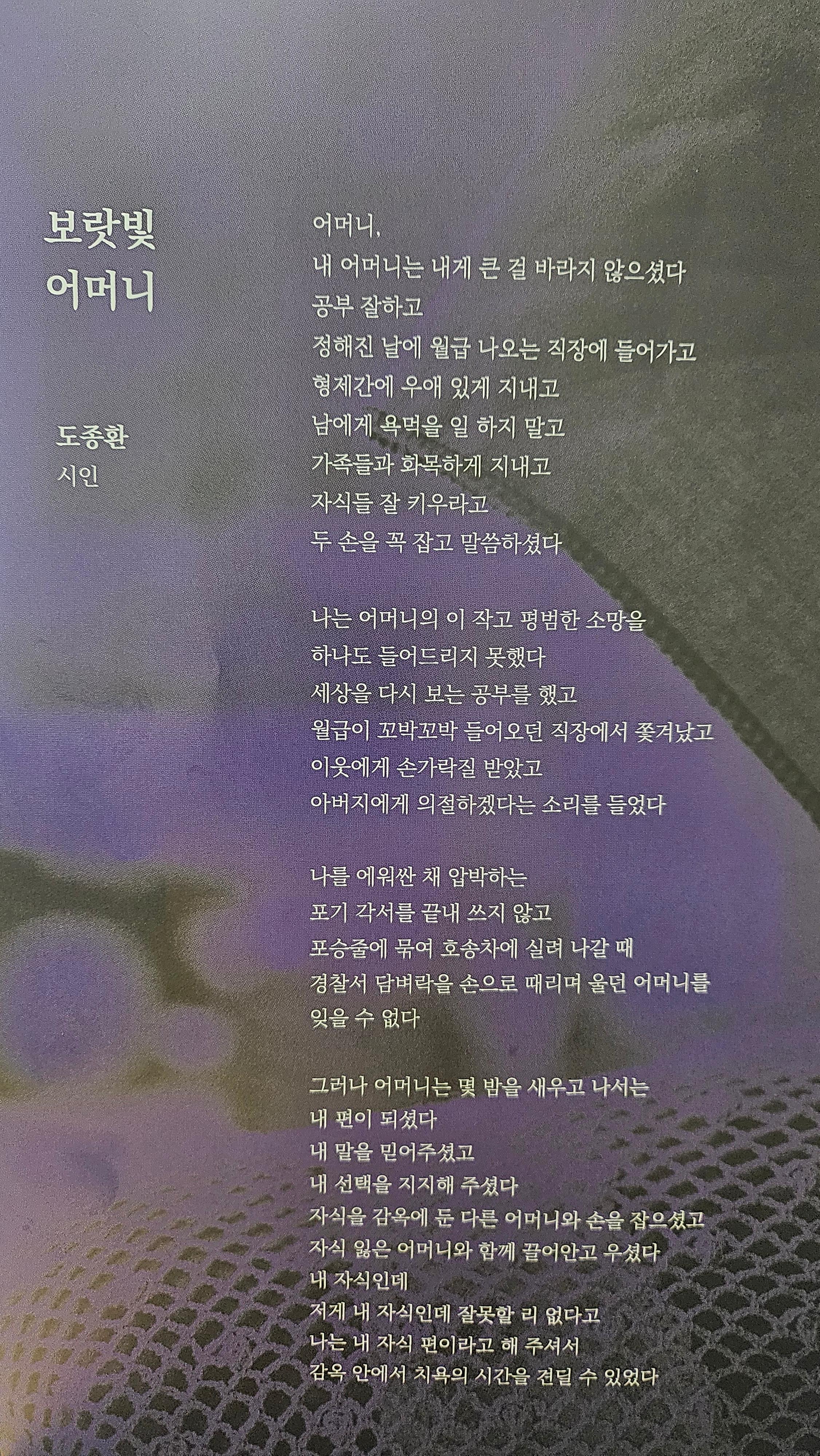 민가협 40주년 기념 특별 헌정 공연 '어머니를 위한 시와 노래의 밤'에서 도종환 시인이 쓴 詩를 시인이 직접 읽었다. 시인이 쓴 시를 자기가 읽어주는 것만큼 큰 감동이 없다. 주위에서 훌쩍이는 소리가 들렸다. 세상에서 자신을 믿어주는 사람이 아무도 없을 때조차 엄마는 자식을 믿는다. 세상에 유일한 사람이다. 자식은 그 힘으로 세상을 건넌다.