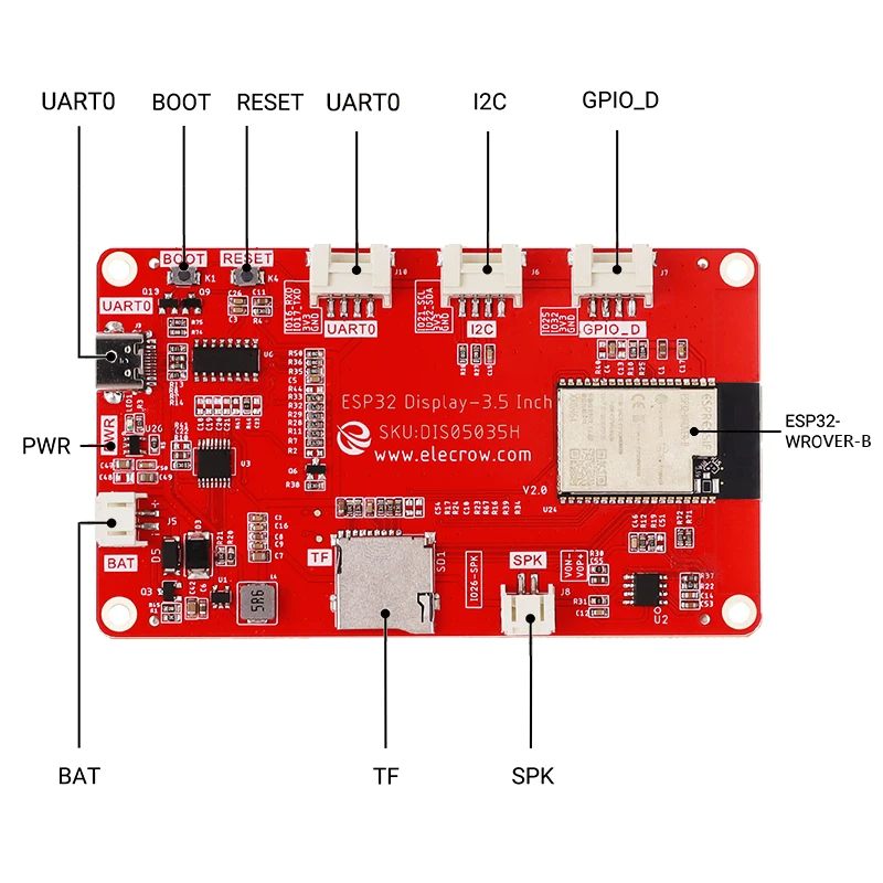 CrowPanel ESP32 디스플레이 3.5 인치 모듈은 320*480 해상도의 LCD 디스플레이를 갖춘 강력한 HMI 터치 스크린입니다. 듀얼 코어 32 비트 LX6 마이크로 프로세서, 통합 WiFi 및 Bluetooth 무선 기능, 최대 240 MHz의 주 주파수를 갖춘 ESP32-WROOM-32 모듈을 주 제어 프로세서로 사용합니다. IoT 애플리케이션 장치 및 기타 장면에 적합한 강력한 성능과 다양한 애플리케이션을 제공합니다.
