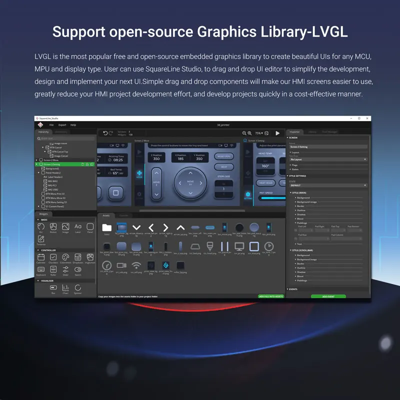 LVGL 그래픽 라이브러리를 지원합니다. 드래그 앤 드롭 UI 편집기를 사용하여 고유한 UI를 디자인하고 구현할 수 있습니다. (아래 그림은 LVGL 공식 UI 디자인 소프트웨어 Squareline Studio입니다)