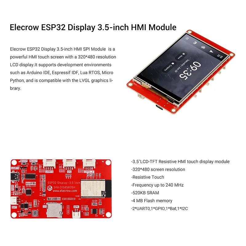 - 개발 환경 지원 Arduino IDE, Espressif IDF, PlatformIO, 마이크로 파이썬 및 LVGL 그래픽 라이브러리와 호환;