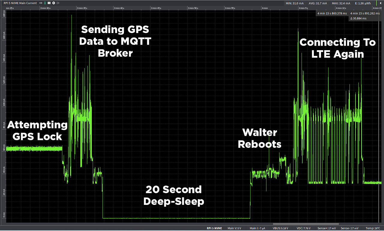 우리가 제대로 잠을 잤는지 확인하기 위해, 매우 정확한 전력 측정 장비인 Otii Arc를 작동시켰습니다 . 오른쪽 이미지는 USB를 통해 5볼트로 전원을 공급했을 때의 한 주기 동안의 모습을 보여줍니다.