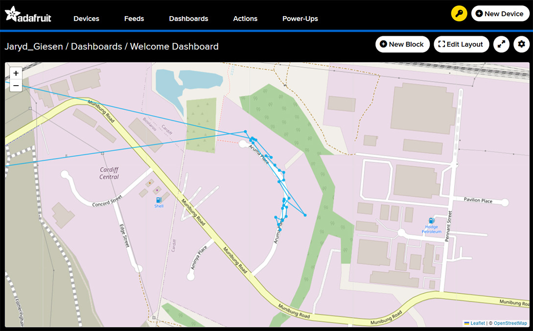 그리고 이 루프의 나머지 부분은 마치 소형 원격 측정 파이프라인처럼 작동합니다. GNNS 위치 정보를 얻기 위해 여러 함수를 사용하고, get_gnns_fix() 함수로 꺼진 LTE를 다시 켠 다음, publish_csv_location() 함수를 통해 해당 데이터를 Adafruit IO로 전송합니다 . 이 세 단계를 반복하면 Walter가 셀룰러 통신 범위 내에 있는 한 어디를 가든 추적할 수 있습니다!