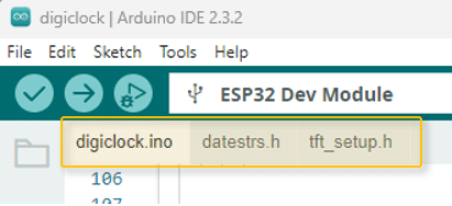 이제 아두이노 IDE에 " digiclock.ino"와 " tft_setup.h"라는 이름의 탭 두 개가 표시될 것입니다.