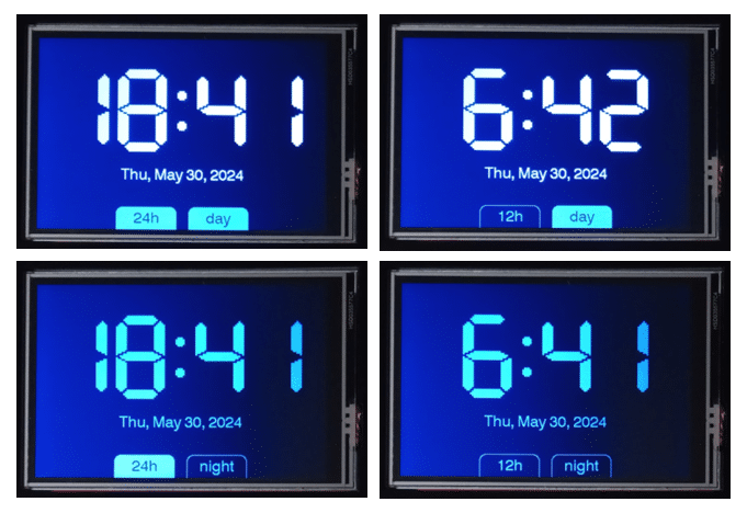 updateDisplay() 함수는 기본적으로 상태 is24h와 isDay플래그에 따라 네 가지 다른 화면을 표시합니다. 아래 이미지는 이 네 가지 화면을 보여줍니다.
