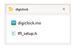 아두이노 IDE를 열고 "프로젝트 digiclock"라는 이름의 프로젝트를 생성한 후 저장(다른 이름으로 저장)하세요. 그러면 "프로젝트 digiclock" 폴더가 생성되고 그 안에 "프로젝트 digiclock.ino" 파일이 만들어집니다. 이 폴더 안에 "프로젝트"라는 이름의 파일을 하나 더 생성하세요 tft_setup.h. 프로젝트 폴더는 다음과 같은 구조가 되어야 합니다.
