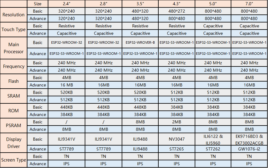 참고로, CrowPanel 3.5인치 ESP32 디스플레이는 2.4인치부터 7인치까지 다양한 크기의 디스플레이 제품군 중 하나입니다. 크기 외에도 해상도, 디스플레이 드라이버 및 ESP32 모델에서 차이가 있습니다. 아래 표를 참조하십시오.