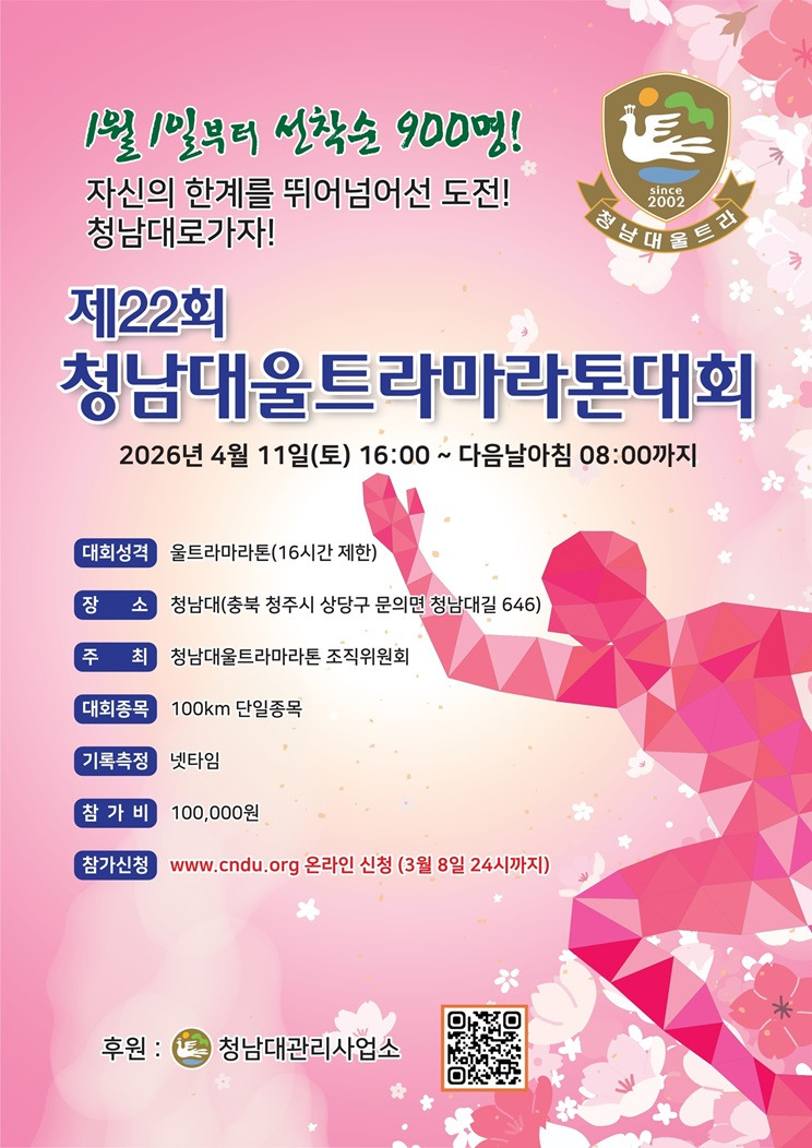 ♦ 참 가 신 청 접수기간 : 2026년 1월 1일 ~ 마감 (3월8일 이후 취소불가)참가비 입금기준 900명으로 마감합니다.청남대인파문제로 부득이 www.cndu.org 에서 참가신청요령에 의하여 신청