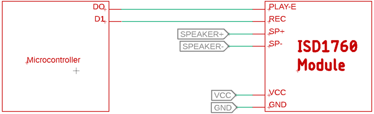 ISD1820 기반 음성 녹음 및 재생 모듈은 3개의 디지털 I/O 통신 핀을 통해 PIC , Arduino 등과 같은 모든 마이크로컨트롤러를 사용하여 쉽게 제어할 수 있습니다.