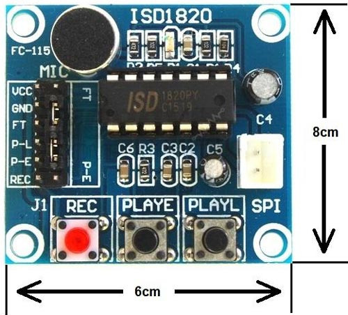 ISD1820 은 다중 세그먼트 녹음이 가능한 소형 음성 녹음 및 재생 모듈입니다. 사용자는 내장된 저항값을 조절하여 각 용도에 맞는 고품질 녹음(8~20초)을 구현할 수 있습니다. 이 음성 녹음/재생 모듈은 최대 100년 동안 데이터를 보관하고 최대 10만 회의 삭제/녹음 주기를 지원하는 내장 플래시 메모리를 탑재하고 있습니다.