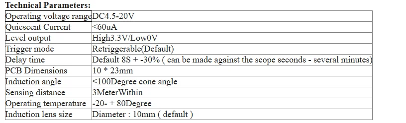 ■반복 가능한 트리거: 센서 출력이 높고 지연 기간이 있으며 감지 범위에 인간 활동이 있는 경우 지연 후 사람들이 떠날 때까지 출력이 높게 유지됩니다. 감지 모듈이 감지한 후 자동으로 확장됩니다. 인체의 모든 활동은 지연 기간이 있으며 마지막 활동 시간은 지연 시간의 시작점입니다.