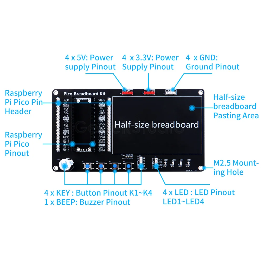 라즈베리 파이 피코/피코용 브레드 보드 키트, 구리 기둥 M2.5 너트 내장, LED 조명, 버튼 버저, 하프 사이즈 브레드 보드