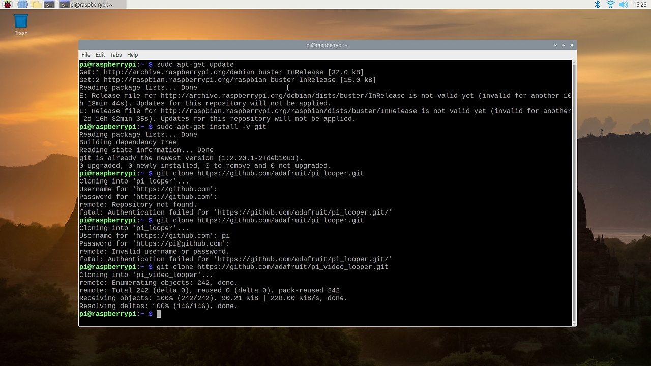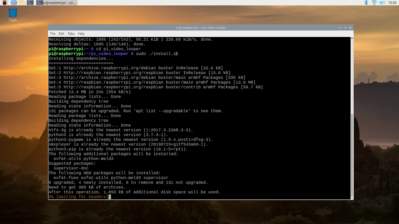 이 단계에 도달하면 콘솔에 아래 내용을 입력하고 Enter 키를 누르세요(철자가 정확한지 확인하세요). 아래 이미지에서 이 과정을 확인할 수 있습니다. 이제 비디오 루퍼의 모든 코드가 소스 코드에서 라즈베리 파이로 직접 다운로드되었고, 최신 버전의 설치 프로그램이 추가되었습니다.