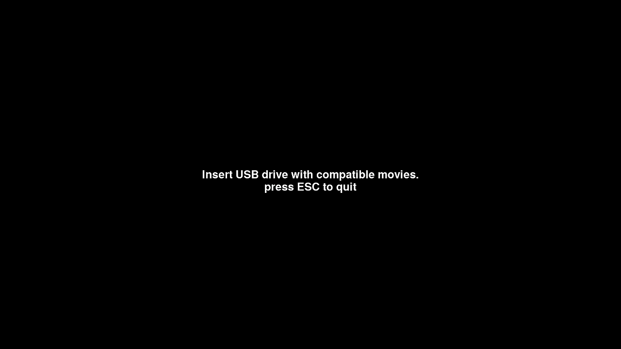 약 2분 후 콘솔에 "| 완료! |" 메시지가 표시되면서 설치가 종료됩니다 . 그런 다음 화면이 완전히 검게 변하고 "| 호환되는 영화가 있는 USB 드라이브를 삽입하세요. ESC 키를 눌러 종료하세요 |" 라는 메시지가 나타납니다 . 아래 이미지에서 이 화면을 확인할 수 있습니다. 아래 메시지가 표시되면 설치가 성공적으로 완료된 것이며, 이제 미디어 반복 재생 프로그램이 반복 재생할 비디오를 찾고 있는 것입니다.
