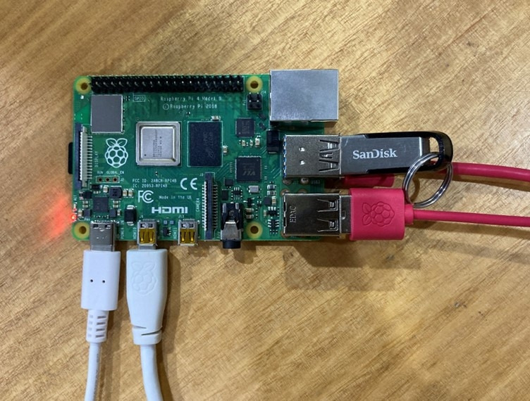 자, 이제 본론으로 돌아가서, 라즈베리 파이, 모니터, 그리고 주변기기(마우스와 키보드)에 필요한 모든 케이블을 연결해 보겠습니다. 마지막으로 연결할 케이블은 USB-C 케이블로, 라즈베리 파이에 전원을 공급하고 전원을 켜는 역할을 합니다. 아래 이미지에서 이 모든 연결 과정을 확인할 수 있으며, 미리 USB 메모리도 꽂아 두었습니다.